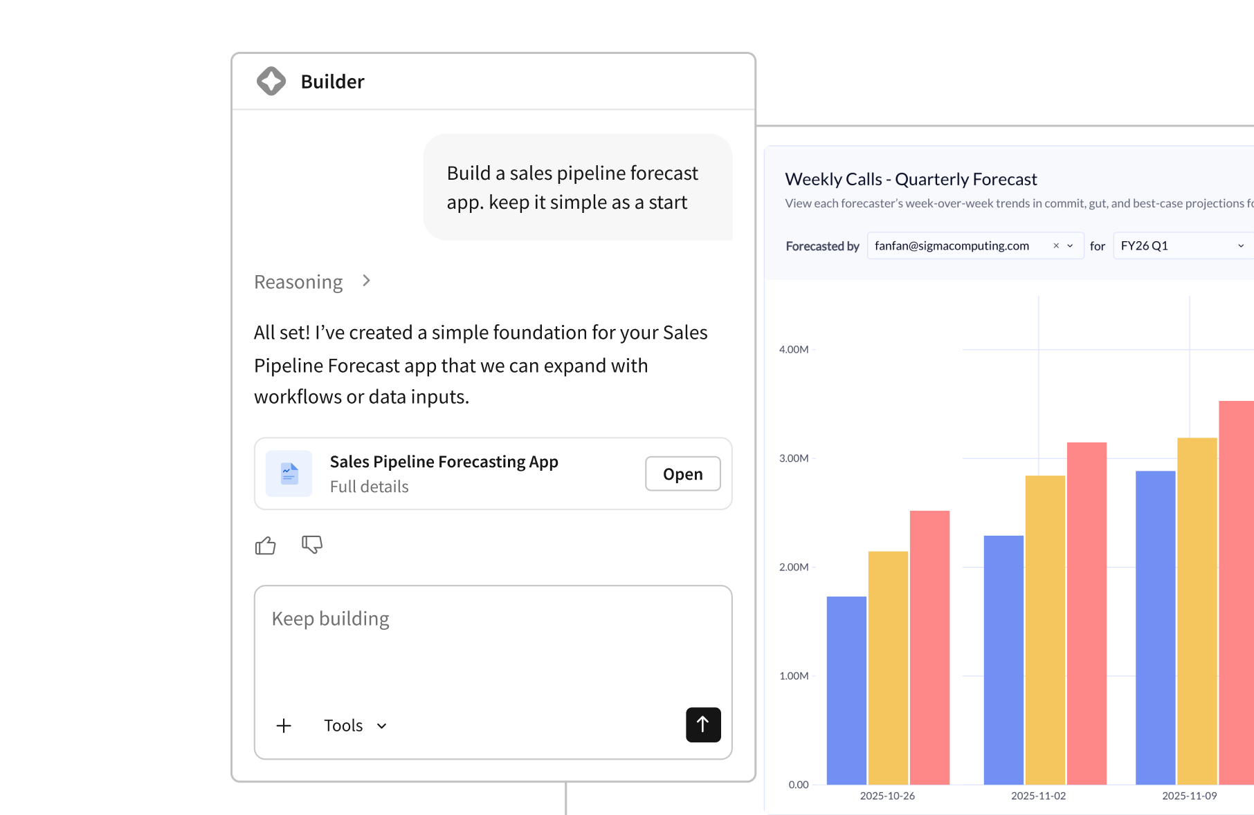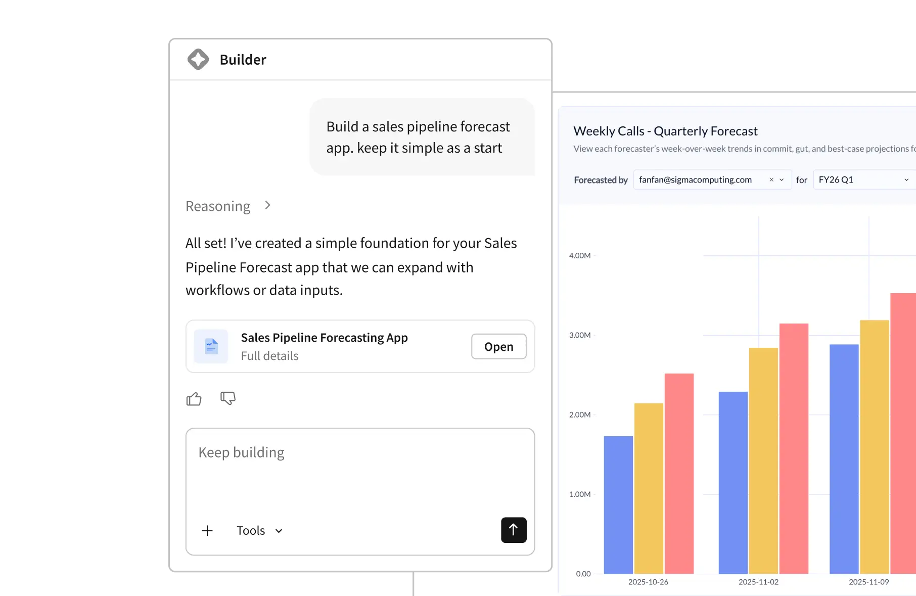 Chat with AI to build the exact dashboards, reports, and apps you need on the data you trust.