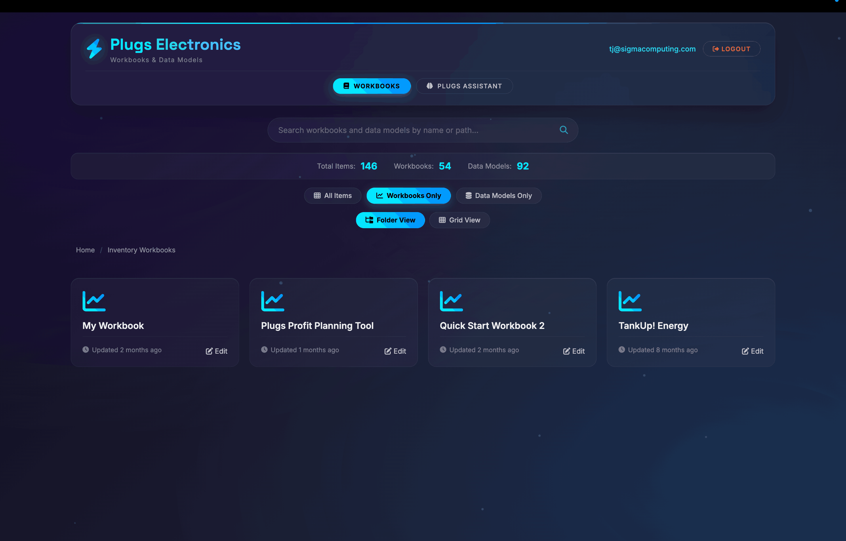 An example of white-labeled embedded analytics powered by Sigma, giving end users a native experience to create, manage, and explore multiple workbooks directly within their product.