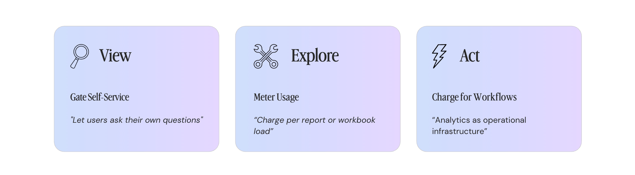 The view → explore → act progression is a monetization roadmap as much as a feature description. Each stage creates a natural upgrade trigger: a moment where a user's needs outgrow the current tier and the next tier's value is obvious enough to justify the price.