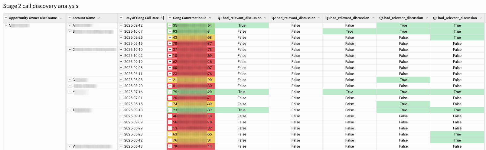 There were five questions I thought we should be asking during those calls to surface the specific pains that Sigma uniquely solves for, but I wasn’t sure they were actually being used. So, I listed them out and built a tool where each row represented a Stage 2 call, and each column was one of the five questions. It was a simple “yes or no,” “red or green” system. If you covered more than two questions, it was green. Two was yellow. Zero was red.