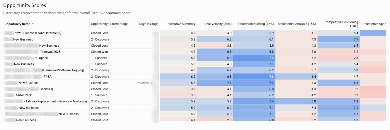 To make the process more user-friendly, I pulled in help from our analytics team to build an interface that reps can actually use. Now, every Stage 2 call gets 10 scores. Nine are component areas—like discovery depth or stakeholder alignment—that roll up into a weighted executive score. Instead of one vague rating, sales reps can see precisely where they’re strong and where they need to focus on improvement.