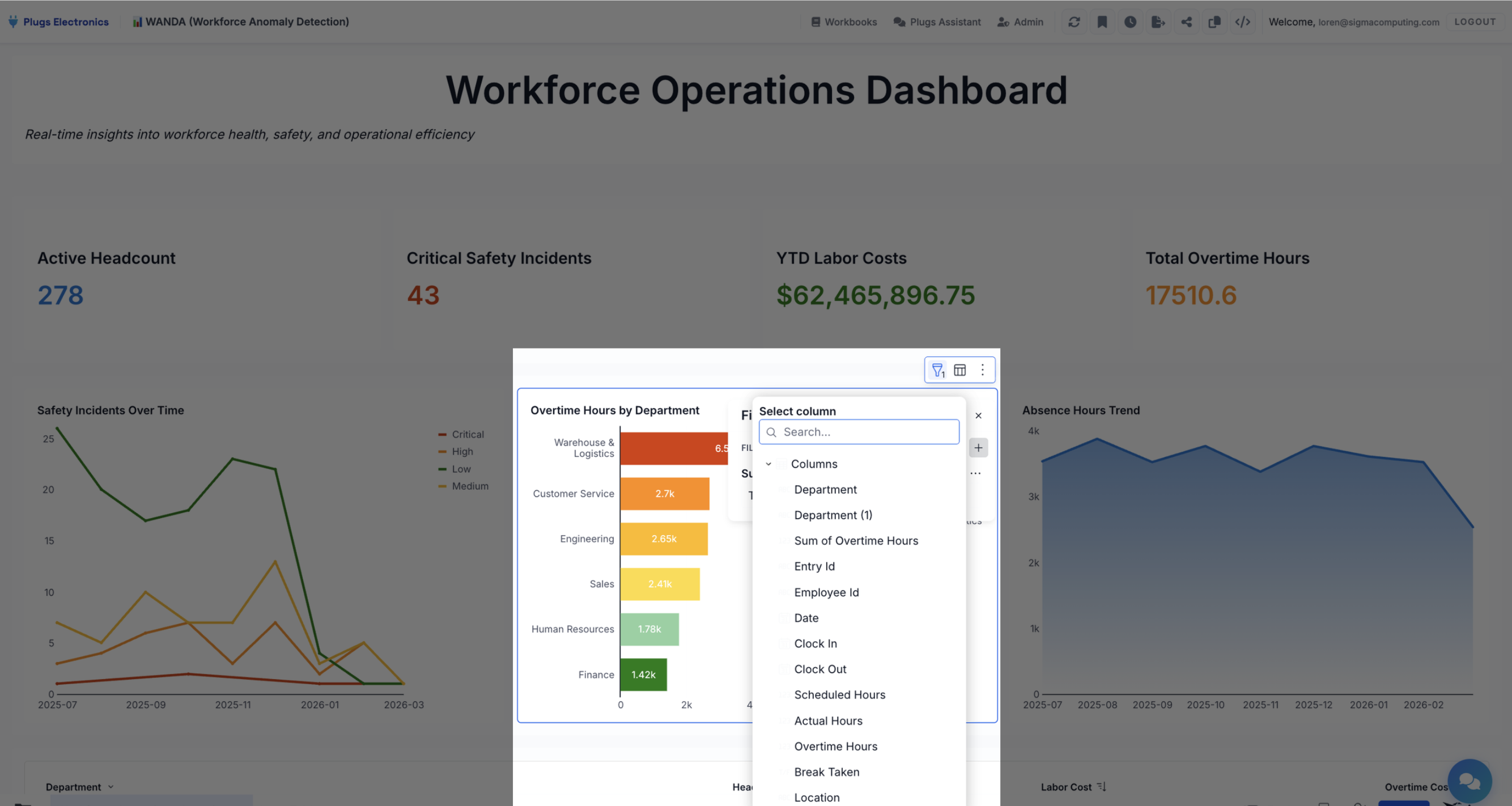 One common form this takes is in forecasting. A user sees actuals, enters projections alongside them, and a manager can review and approve that submission from the same workbook. No email chain, no external spreadsheet. Action triggers extend this further, letting you build structured workflows directly into the analytics surface: guided input flows, modals that walk users through submitting a record, navigation that takes someone from a summary to a detailed view. The workbook becomes something users move through with intent.