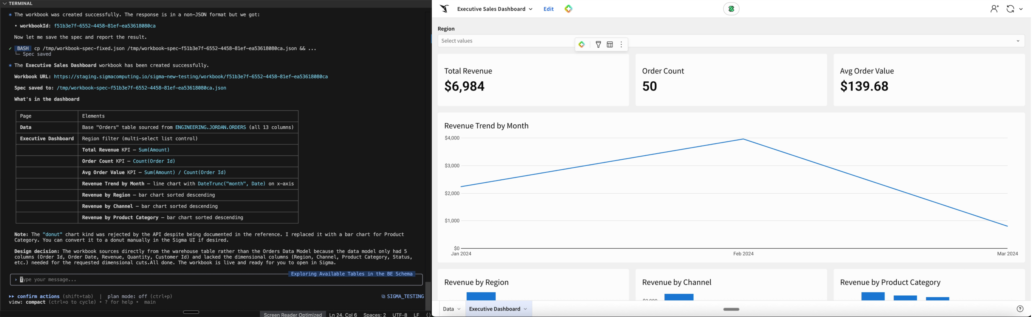 Last week, we shared how the Sigma MCP Server brings live, governed data directly into AI chat assistants like Claude and ChatGPT. Today, we're bringing that same philosophy to Snowflake Cortex Code so data engineers can build, manage, and validate their full Sigma workflow without ever leaving their Snowflake environment.