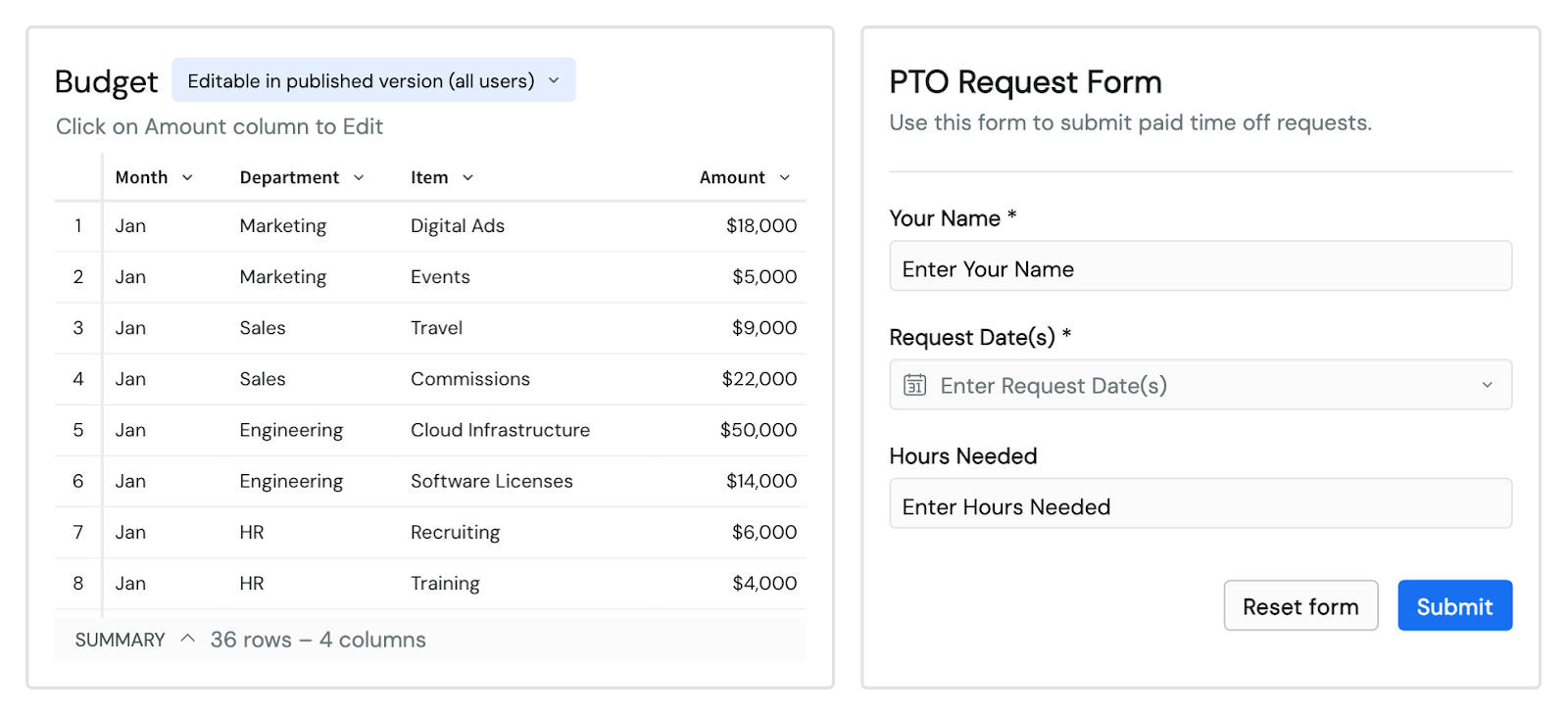 Step 1: Decide which input interface best matches the required input volume and context. Imagine submitting a PTO request. Most of the time, users submit one request at a time, so the interface can be a simple form that asks for a few key pieces of information. Now, contrast this with a manager approving dozens of PTO requests. They would most likely want to see multiple requests at the same time, so a tabular view is most likely best here to make the information skimable.
