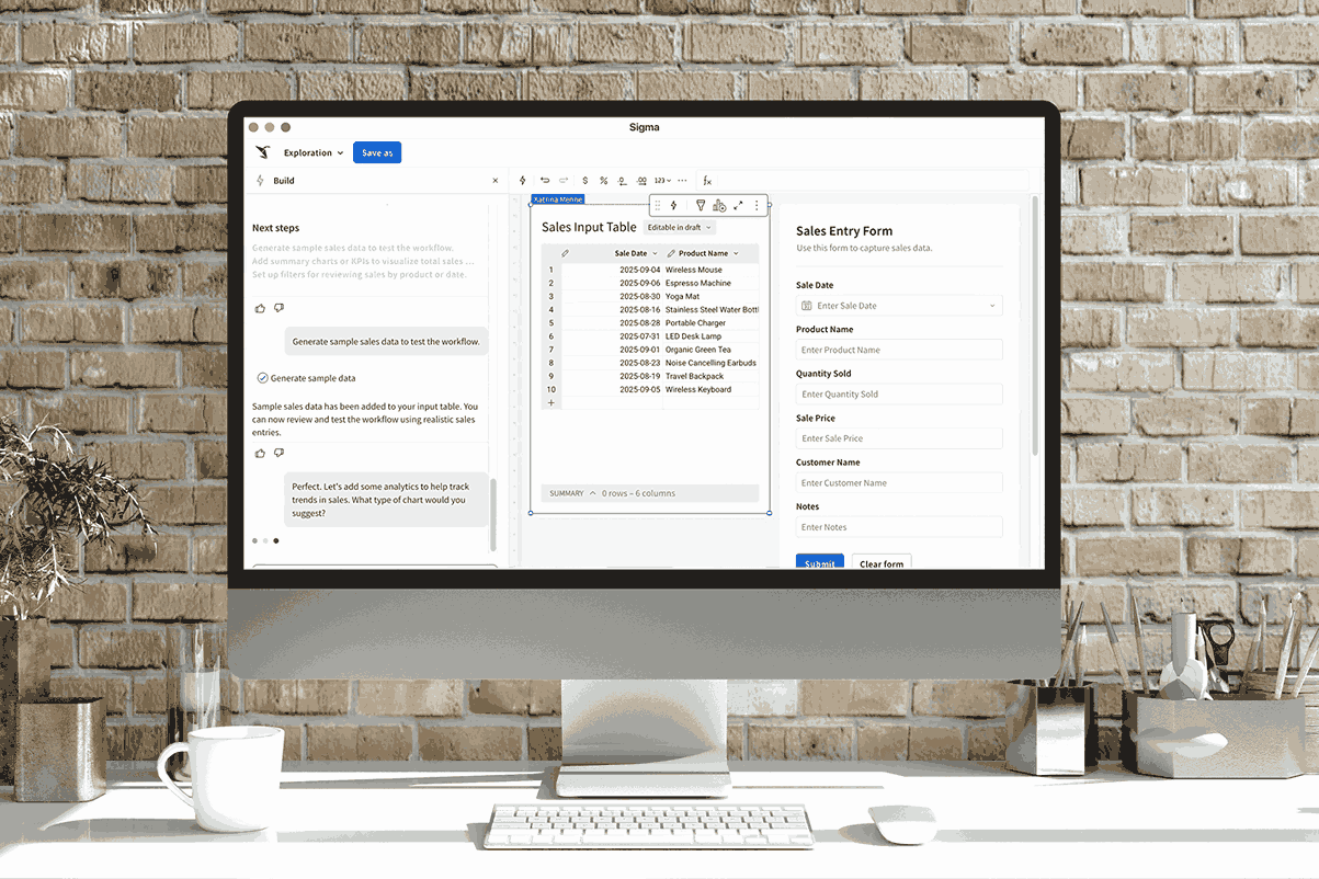 Simply describe the data app or workbook you want to create, and Sigma’s AI Builder (Private Beta) will vibe code it for you. AI gets you most of the way there, and you can easily edit the details yourself—no coding skills required.
