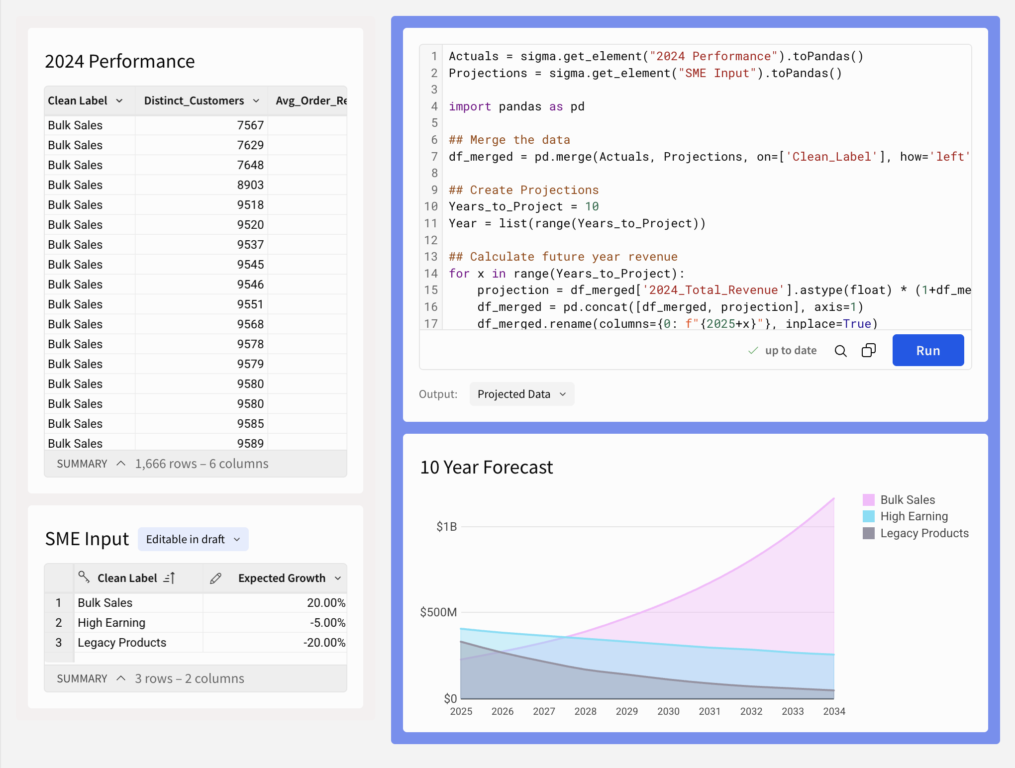 Bring the data and LLMs from your warehouse together with the governance, infrastructure, actions framework, and UI of Sigma.