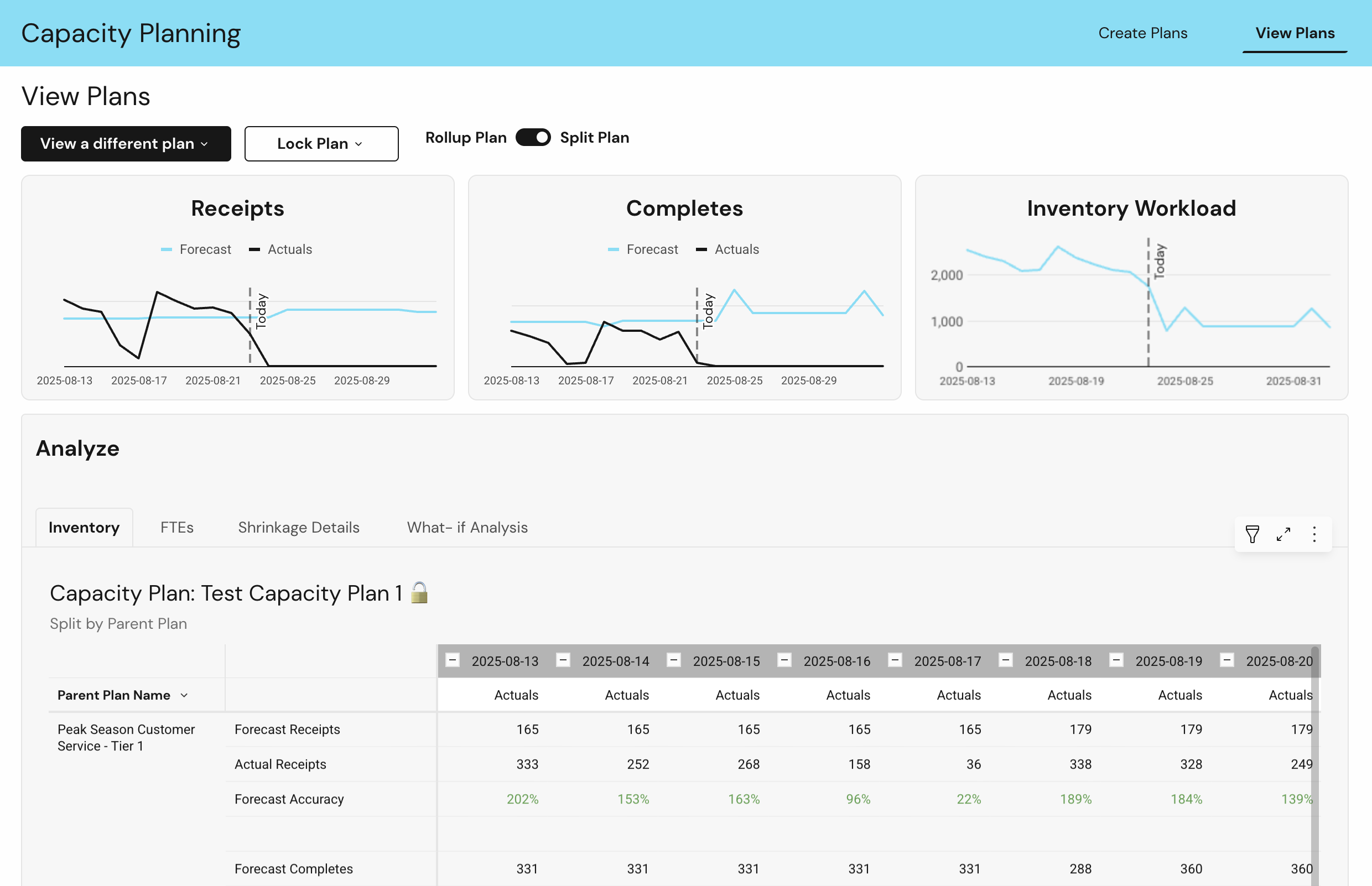 You can create and lock plan versions, split and roll up parent/child plans, and track forecast vs actuals across inventory, labor (FTEs), shrinkage, and other drivers. Every edit is auditable, every view is current, and the plan stays connected to the operational data it depends on.
