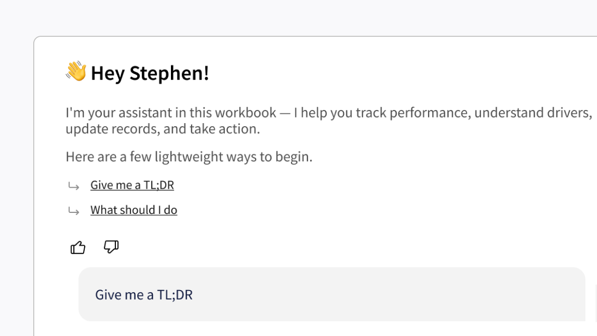 Query governed data using natural language. Every answer includes the logic, formulas, and filters that produced it—so users can verify results without leaving the interface.