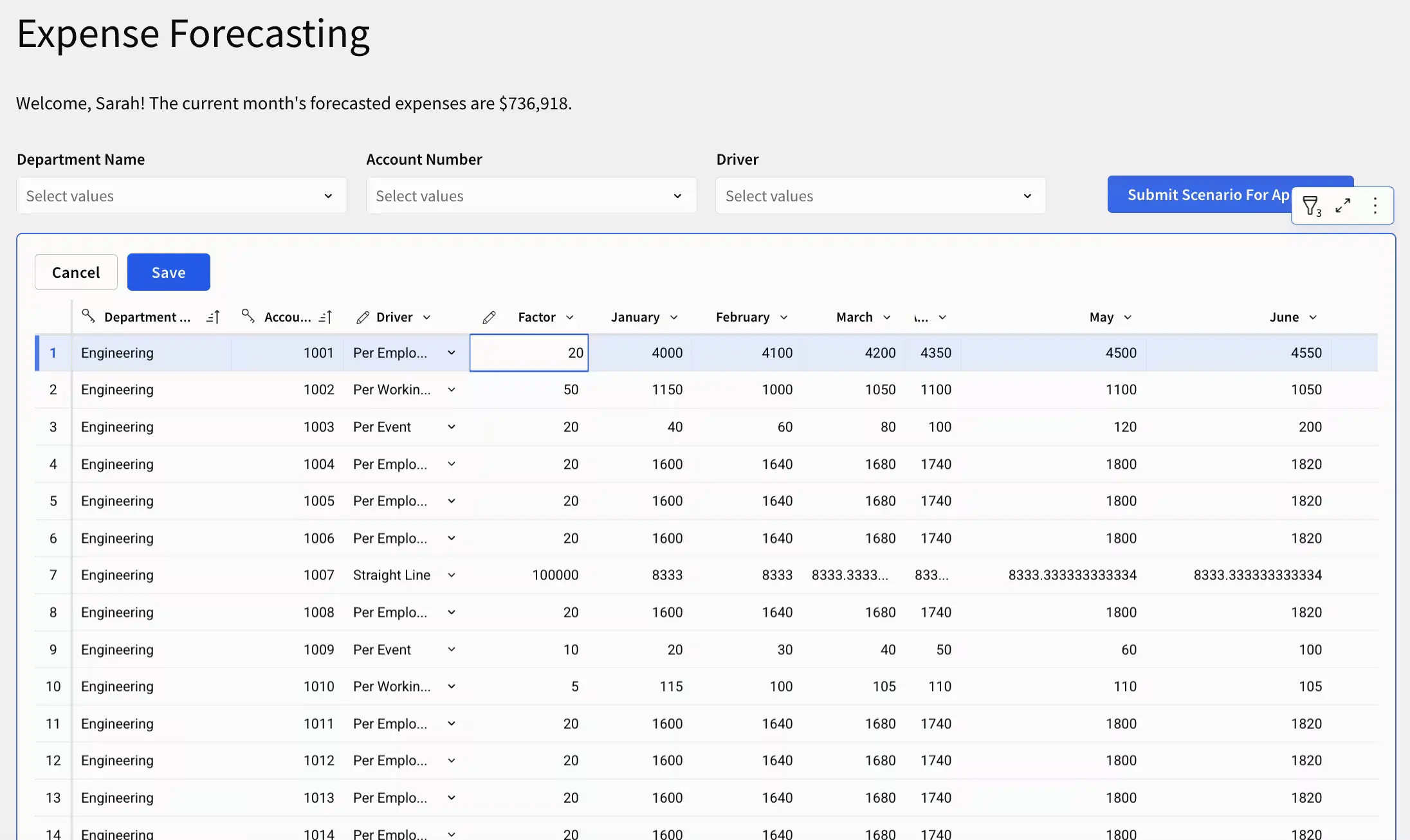 Enable teams to input and adjust monthly forecasts while maintaining a centralized view of total expenses.