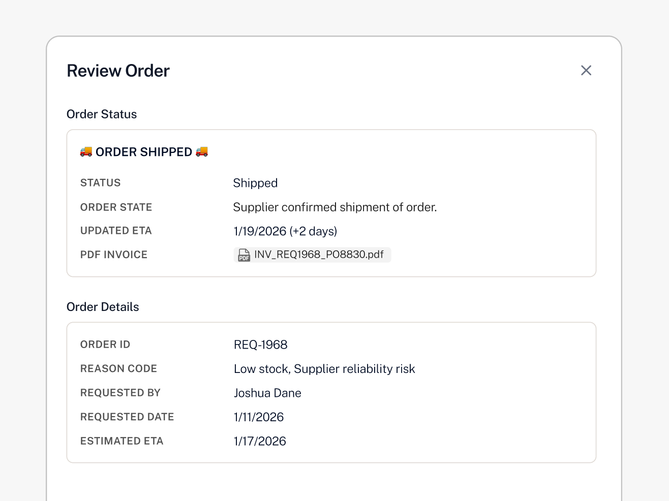 Teams track vendor reliability, lead times, quality, and pricing in one place. Scorecards combine contract terms, performance history, and benchmarks to support sourcing decisions.